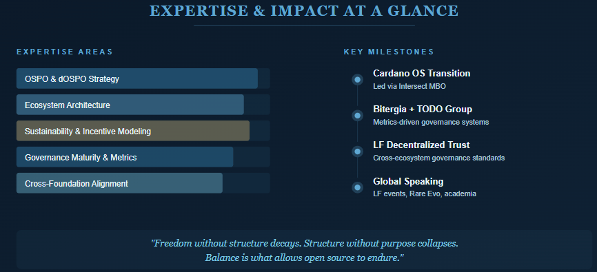 Christian led Cardano’s open-source transition through Intersect MBO, built metrics-driven governance systems in collaboration with Bitergia and the TODO Group, and aligned governance standards across Cardano, LF Decentralized Trust, and ecosystem partners. He has linked funding decisions directly to technical maturity and contributor readiness, and has spoken at Linux Foundation events, Rare Evo, and academic institutions on the practice of decentralized governance.