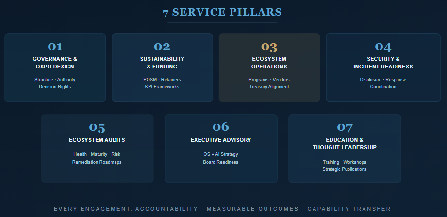 Direct advisory for senior leaders navigating open source and AI as institutional infrastructure. Available on retainer or time-boxed engagement.